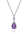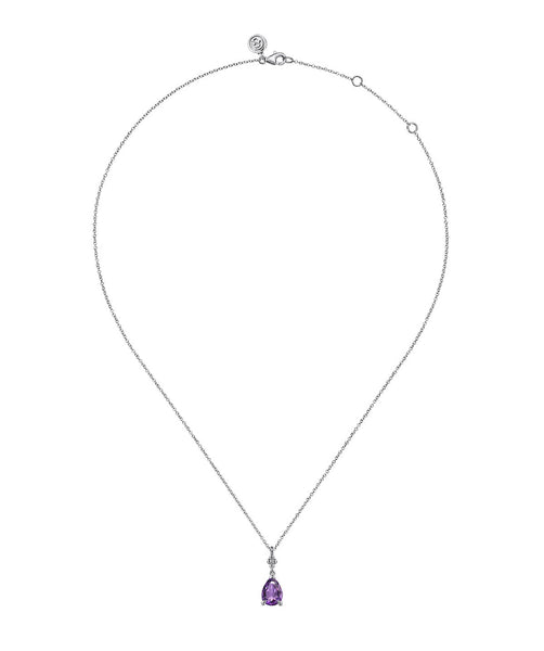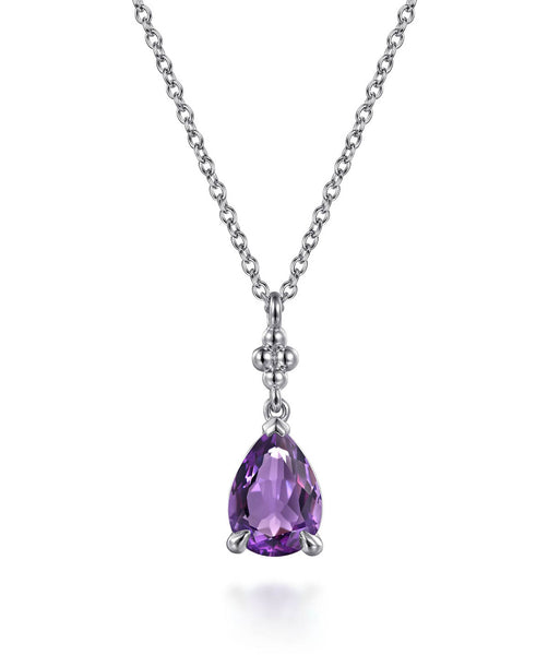 One 2 carat pear shaped amethyst is prong set in sterling silver. Chain length measures 17.5 inches.
