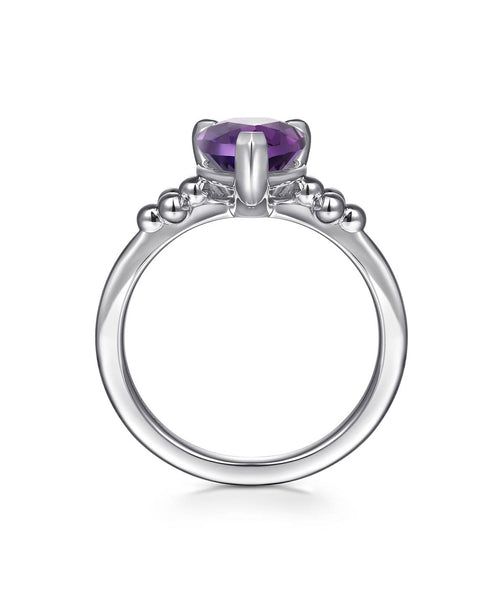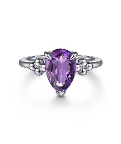 A natural 2 carat pear amethyst is prong set and features classic Bujukan beads accenting both sides. Size 7.