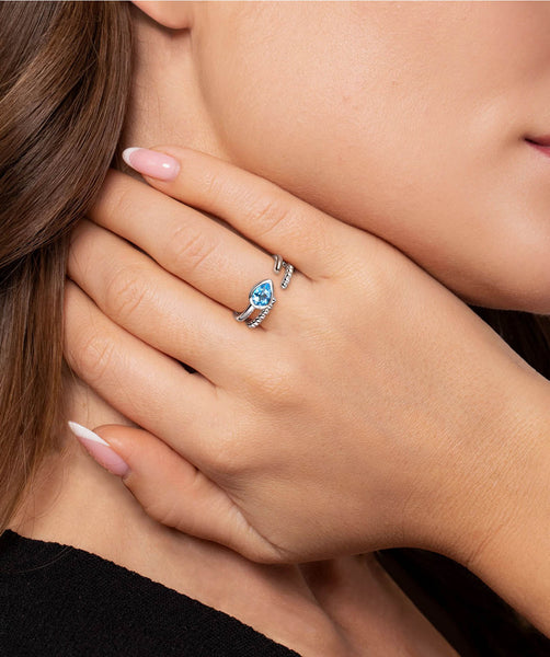 A natural pear Swiss blue topaz is bezel set and features classic Bujukan beads accenting both sides. Size 7.