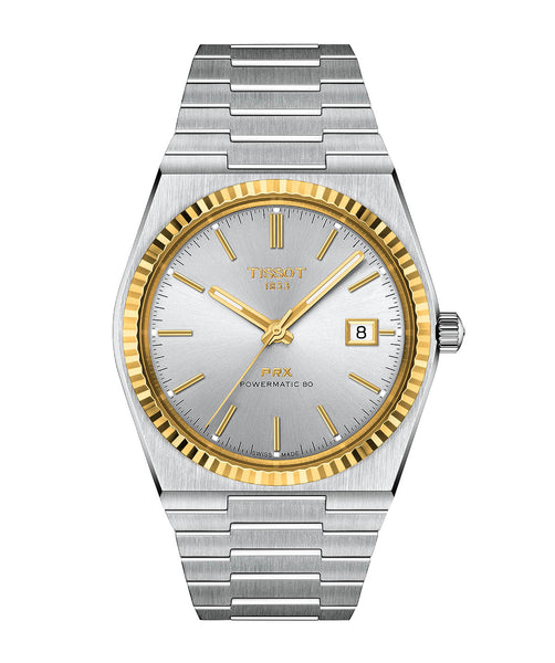 In 1978, Tissot created a quartz model distinguished by a slim case, narrow hour-markers and a steel bracelet. Its wide horizontal lugs, typical of the time, were perfectly integrated into the flat tonneau-shaped case. A few years later, Tissot registered the name PRX. "PR" stands for "precise" and "robust". Its flexibility and suppleness make it a real success in terms of ergonomic design, and provide exceptional comfort. The satin-finish on the outside is just as meticulous as the polish on the inside. The hands of this watch are coated with SuperLumiNova®. This brings the dial closer to the watch crystal. The optical effect achieved by Tissot's designers makes the watch case appear even flatter and thinner than it actually is. The Tissot PRX Powermatic 80 steel & 18-carat gold features a scratch-resistant sapphire crystal with anti-reflective coating on both sides. Its Swiss Made automatic movement with a power reserve of up to 80 hours is equipped with a Nivachron balance spring, known for its excellent resistance to magnetic fields.