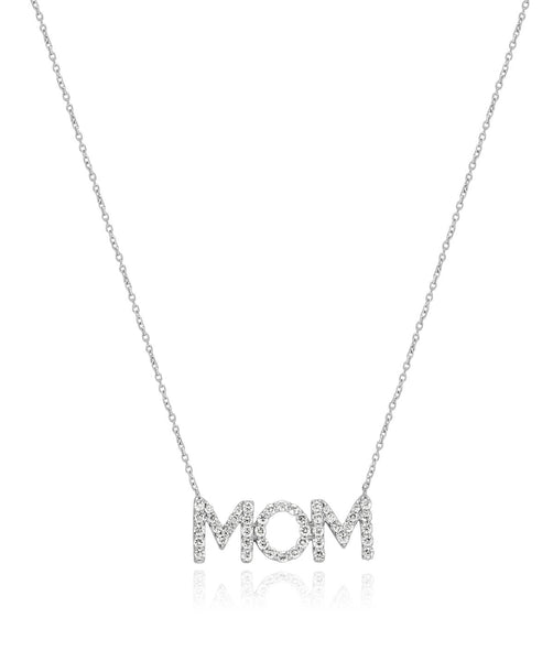 Forty six natural round brilliant cut diamonds make up the letters MOM in this lovely 14k white gold 18 inch pendant necklace.