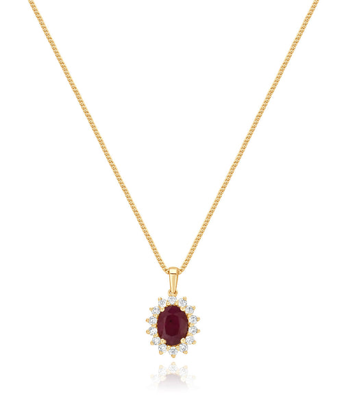 One natural oval red ruby is prong set and surrounded in a dazzling display of 14 natural round brilliant cut diamonds in a halo. Chain sold separately.