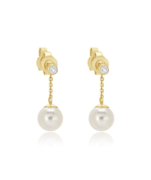 Two 0.10 cttwu natural round brilliant cut diamonds are bezel set while two 7mm pearls are attached to a 14k yellow gold diamond cut cable chain. These dangle earrings are a classic, elegant staple that will be loved for years to come!