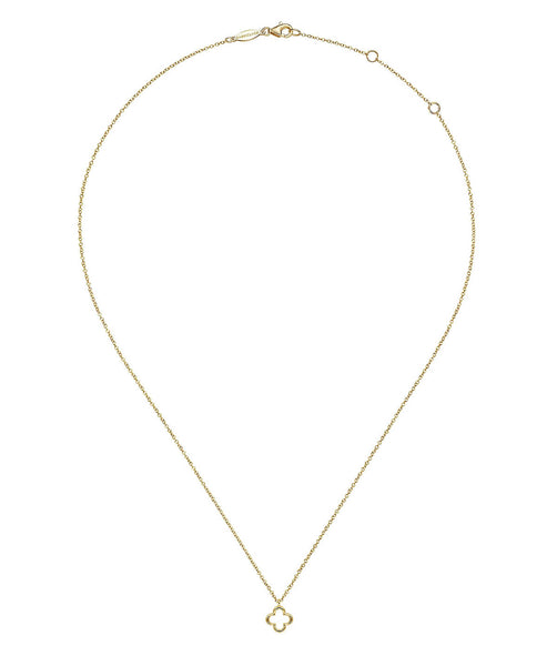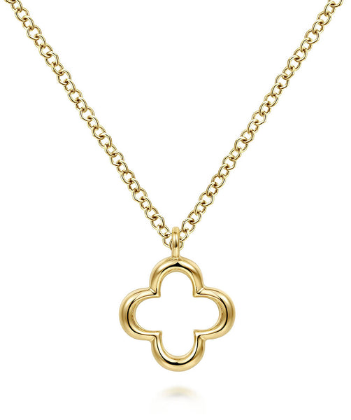 Open clover pendant set in 14k yellow gold on a 17.5 inch cable chain.
