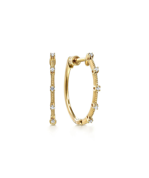 These 20mm hoop earrings feature ten natural round brilliant cut diamonds that are prong set in a station style, with a classic Bujukan beaded edge, and set in 14k yellow gold.