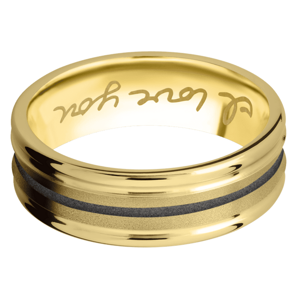 7 mm wide/Concaved Center Round Edges/14K Yellow Gold band with one 1 mm Centered inlay of Gun Metal Grey.