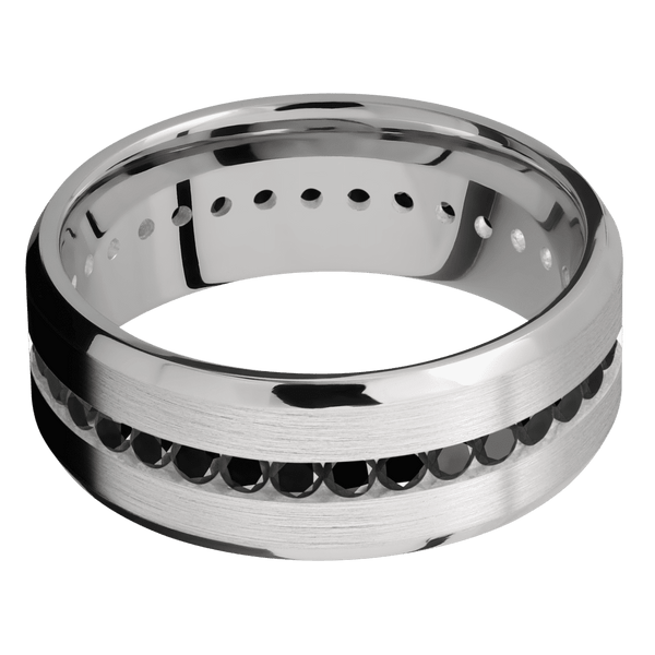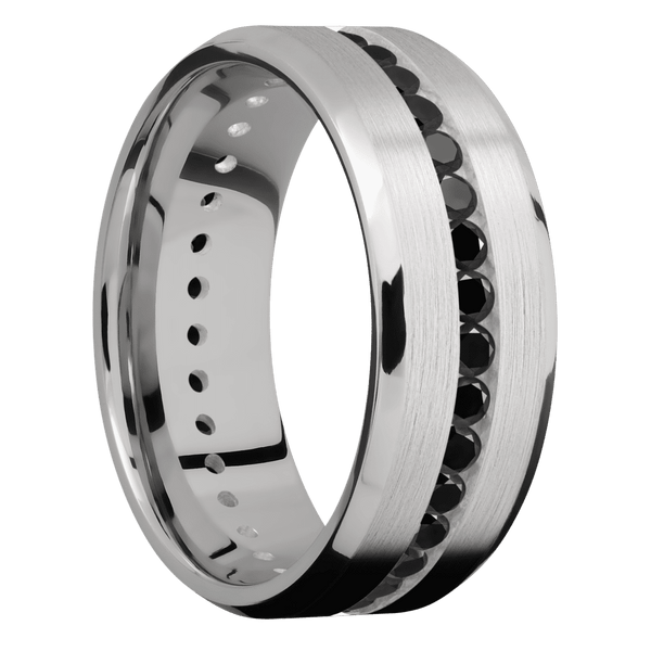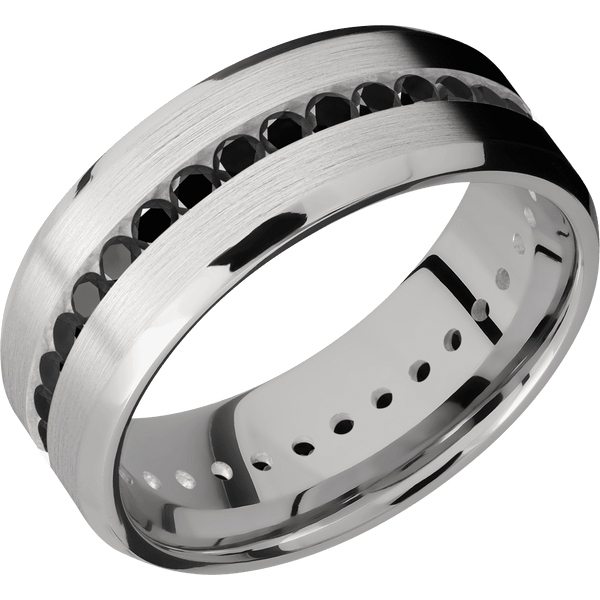 8 mm wide/Beveled/Cobalt Chrome band with an Eternity arrangement of .03 carat Round Black Diamond stones in a Channel setting.