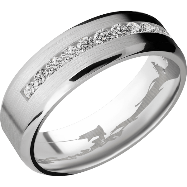 7 mm wide/Beveled/Platinum band with a Half Eternity arrangement of .05 carat Round Lab Grown Diamond (ST) stones in a Channel setting.