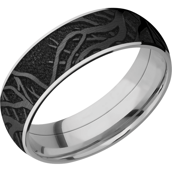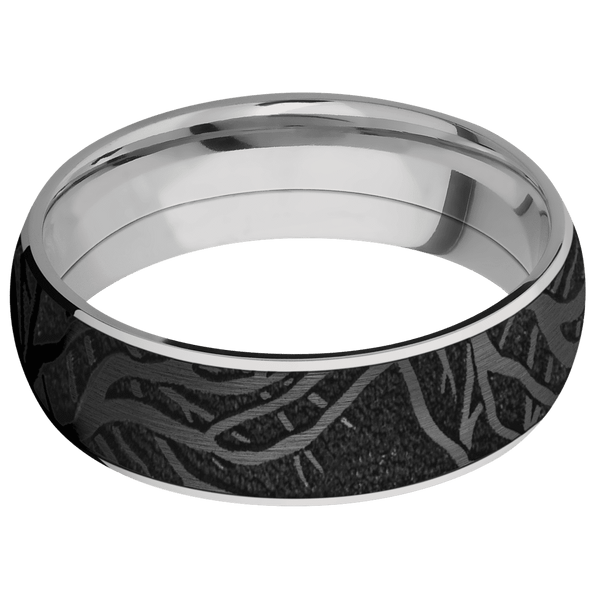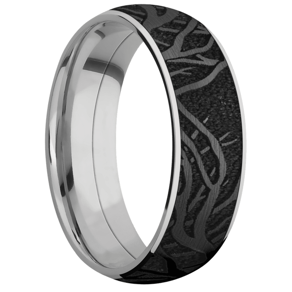 7 mm wide/Domed/Titanium band with one 6 mm Centered inlay of Zirconium with a laser carved Branches pattern.