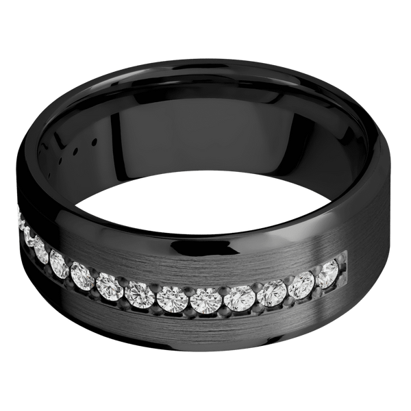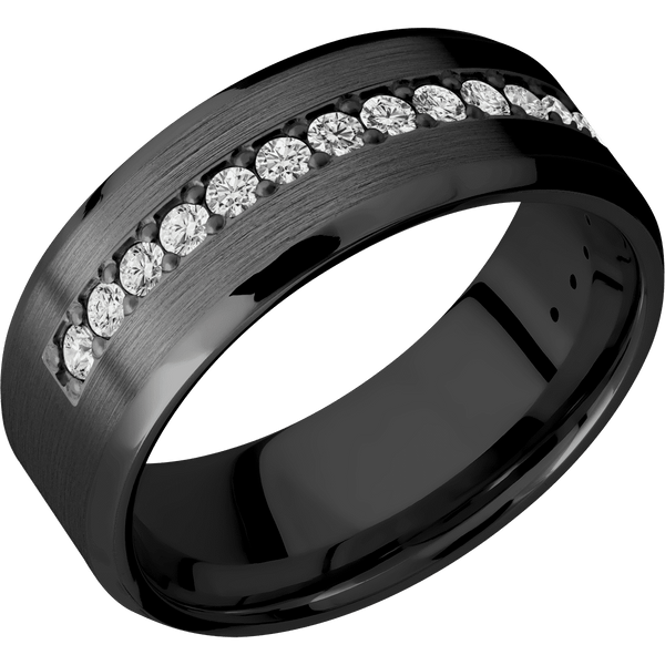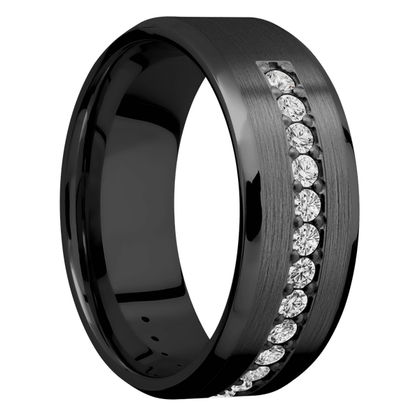 8 mm wide/Beveled/Zirconium band with a Half Eternity arrangement of .03 carat Round Lab Grown Diamond (ST) stones in a Bead setting.